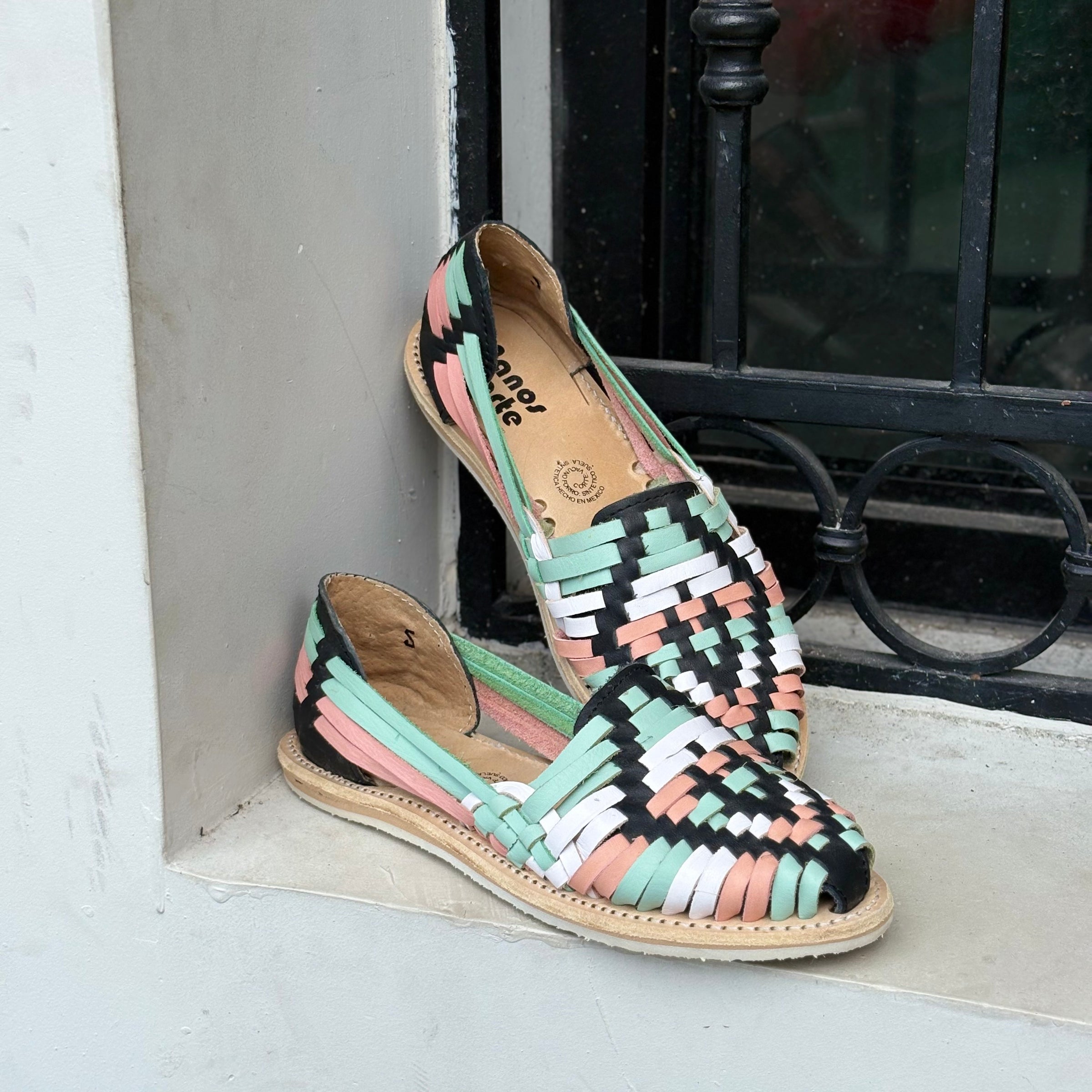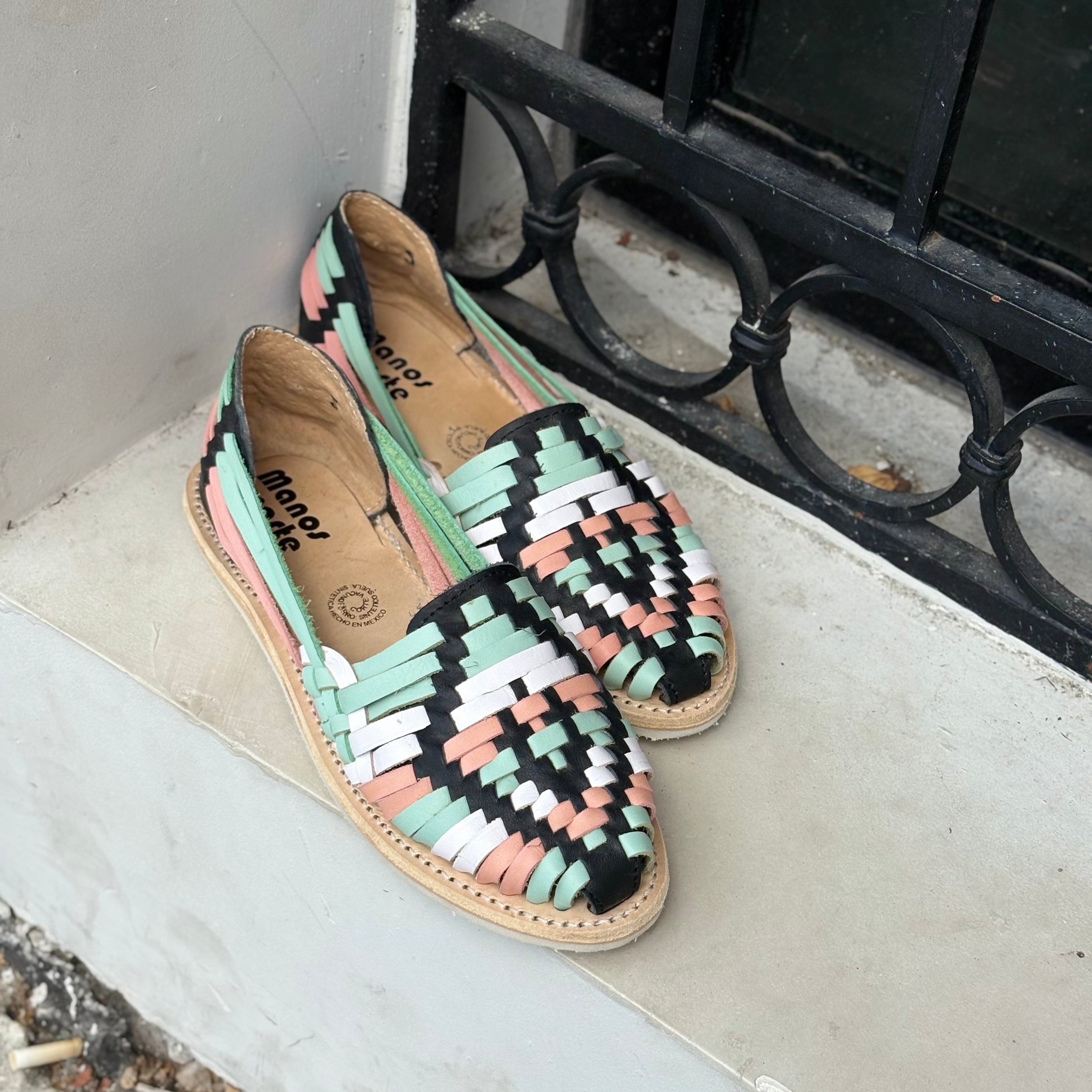Flats artesanales elaborados en cuero genuino, cuidadosamente tejidos a mano con un diseño multicolor que combina tonos pasteles y negro. Su construcción flexible permite una adaptación natural al pie, brindando comodidad durante todo el día.