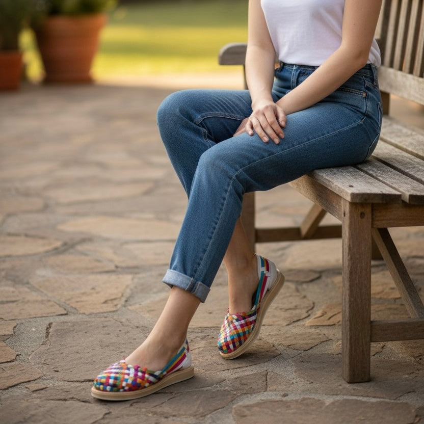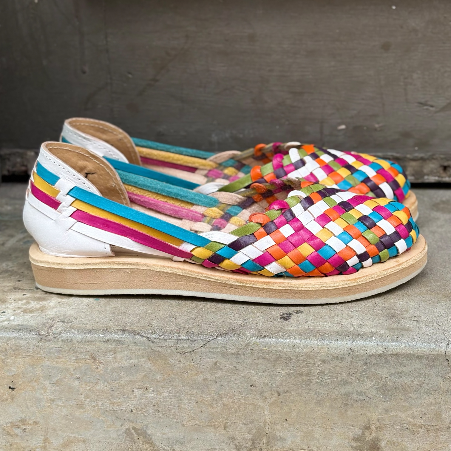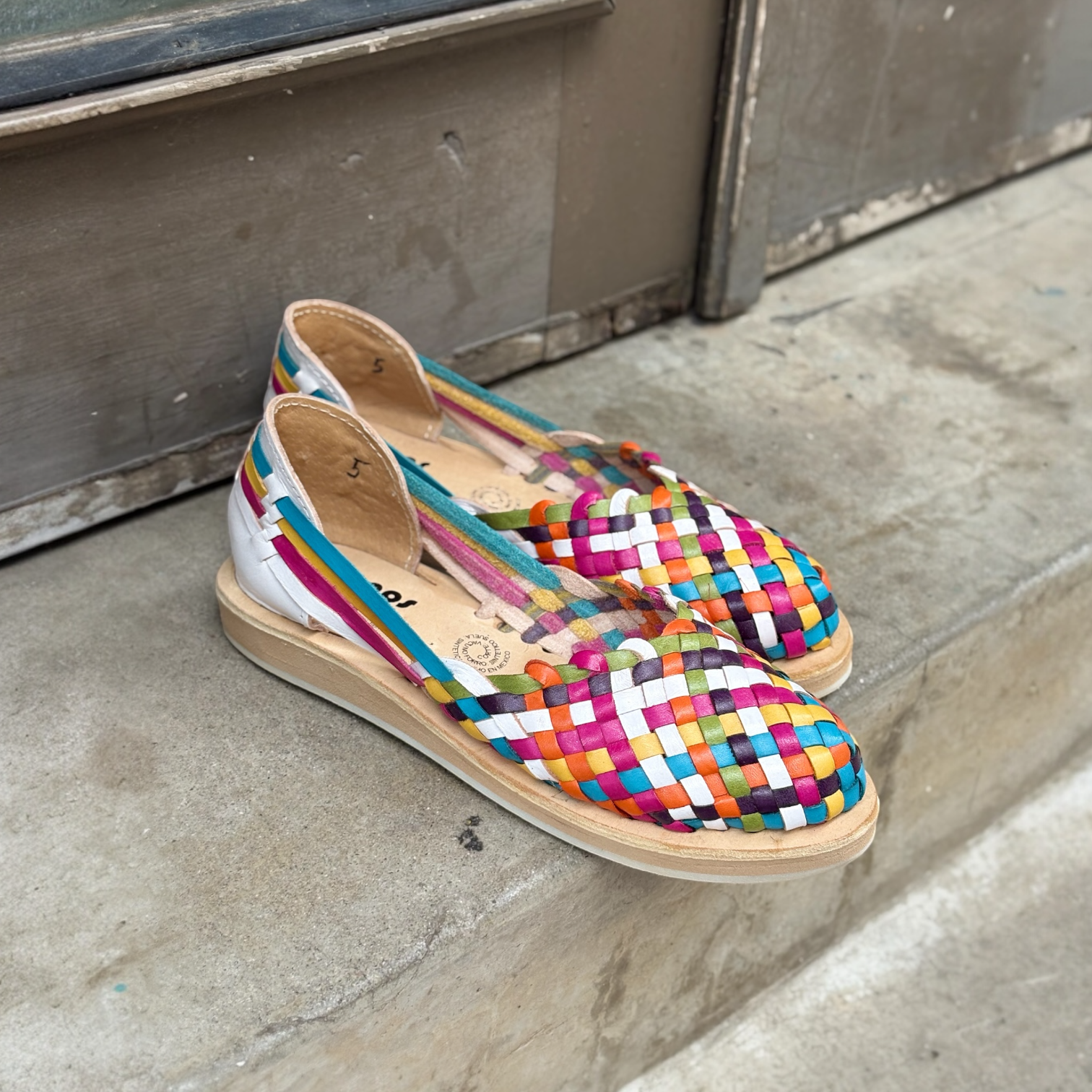 Flats para dama hechos en cuero con tiras tejidas entre si, plantilla confort y suela de goma de 2 cm de alto, elaborado por artesanos mexicanos.