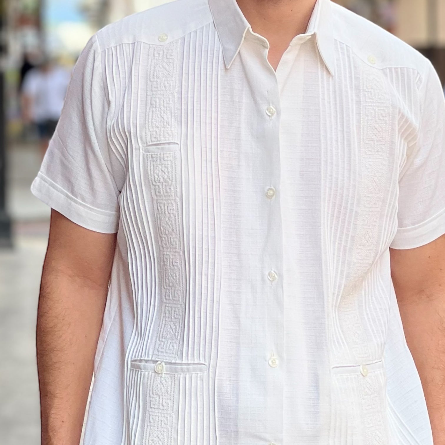 Una prenda de alta calidad y elegancia, la GUAYABERA PRESIDENCIAL Crema está elaborada en Lino con bordados en ambos lados del frente.